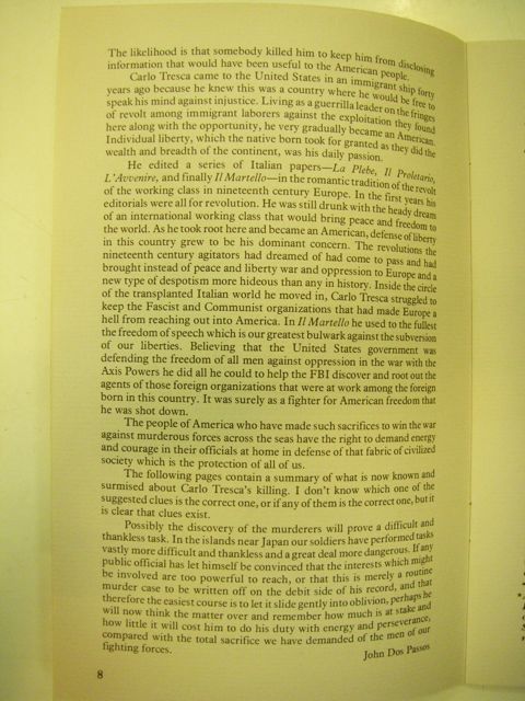 He edited a series of Italian papers- Le Plebe, Il Proletario, L'Avvenire, and finally Il Martello- in the romantic tradition of the revolt of the working class in nineteenth century Europe. In the first years his editorials were all for revolution. He was still drunk with the heady dream of an international working class that would bring peace and freedom to the world. As he took root here and became an American, defense of liberty in this country grew to be his dominant concern. The revolutions the nineteenth century agitators had dreamed of had come to pass and had brought instead of peace and liberty war and oppression to Europe and a new type of despotism more hideous than any in history. Inside the circle of the transplanted Italian world he moved in, Carlo Tresca struggled to keep the Fascist and Communist organizations that had made Europe a hell from reaching out into America. In Il Martello he used to the fullest the freedom of speech which is our greatest bulwark against the subversion of our liberties. Believing that the United States government was defending the freedom of all men against oppression in the war with the Axis Powers he did all he could to help the FBI discover and root out the agents of those foreign organizations that were at work among the foreign born in this country. It was surely as a fighter for American freedom that he was shot down.