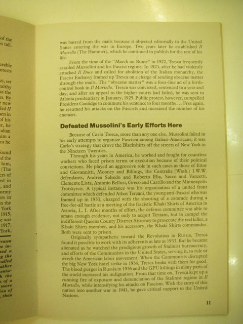 Because of Carlo Tresca, more than any one else, Mussolini failed in his early attempts to organize Fascism among Italian- Americans; it was Carlo's strategy that drove the Blackshirts off the streets of New York in the Nineteen Twenties.