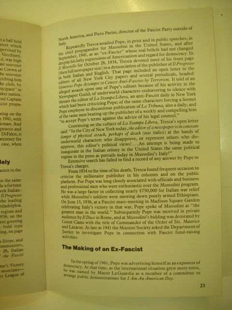 From 1934 to the time of his death, Tresca found frequent occasion to criticize the millionaire publisher in his columns and on the public platform. For Pope was long closely associated with officials and business and professional men who were enthusiastic over the Mussolini program. He was a large factor in collecting neary $750,000 for Italian war relief while Mussolini's soldiers were mowing down poorly armed Ethiopians. On June 13, 1936, at a Fascist mass-meeting in Madison Square Garden celebrating Italy's victory in that war, Pope spoke of Mussolini as "the greatest man in the world." Subsequently Pope was received in private audience by Il Duce in Rome, and at Mussolini's bidding was decorated by Count Ciano with the title of Commander of the Order of Sts. Maurice and Lazarus. As late as 1941 the Mazzini Society asked the Department of Justice to investigate Pope in connection with Fascist fund-raising activities.