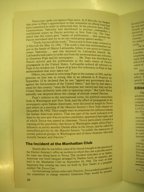 "Truth, but not all the truth," Tresca said in front-page comment in Il Martello for May 14, 1941. "The truth is that that memorandum was put in the hands of Mayor LaGuardia, before it was given to Commissioner Valentine... and was doctored by LaGuardia himself. Mr. LaGuardia took pains to strike out from the memorandum any reference to Generoso Pope and his newspapers... Mr. Pope was described as a Fascist activist and his publications as the main source of Fascist propaganda in the United States. LaGuardia ordered all reference to Pope to be stricken out. I know of at least five references to Pope in that memorandum that were taken out."