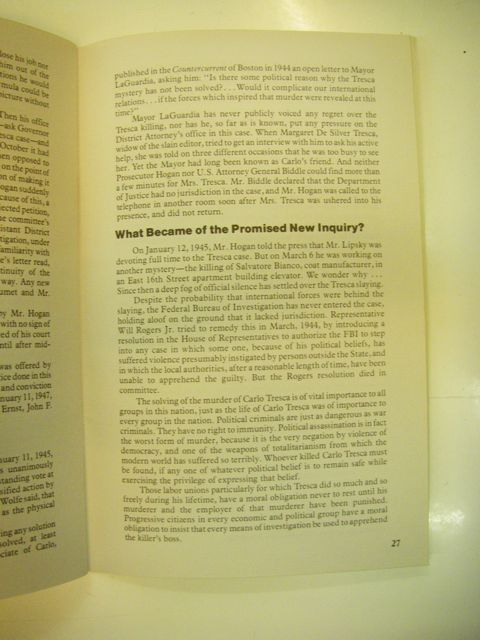 published in the Countercurrent of Bostin in 1944 an open letter to Mayor LaGuardia, asking him: "Is there some political reason why the Tresca mystery has not been solved?... Would it complicate our international relations... if the forces which inspired that murder were revealed at this time?"