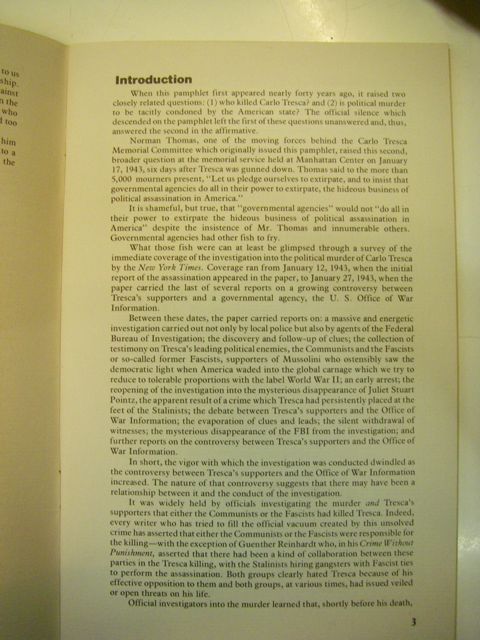 When this pamphlet first appeared nearly forty years ago, it raised two closely related questions. (1) who killed Carlo Tresca and (2) is political murder to be tacitly condoned by the American state? The official silence which descended on the pamphlet left the first of these questions unanswered and, thus, answered the second in the affirmative.
