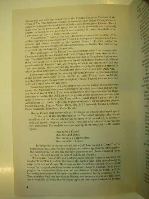 I have two main reasons for reissuing this pamphlet now, in commemoration of the fortieth anniversary of the murder of Carlo Tresca. First, to let the pamphlet raise again the questions it originally posed. Second, to draw attention to Tresca's remarkable life and work.